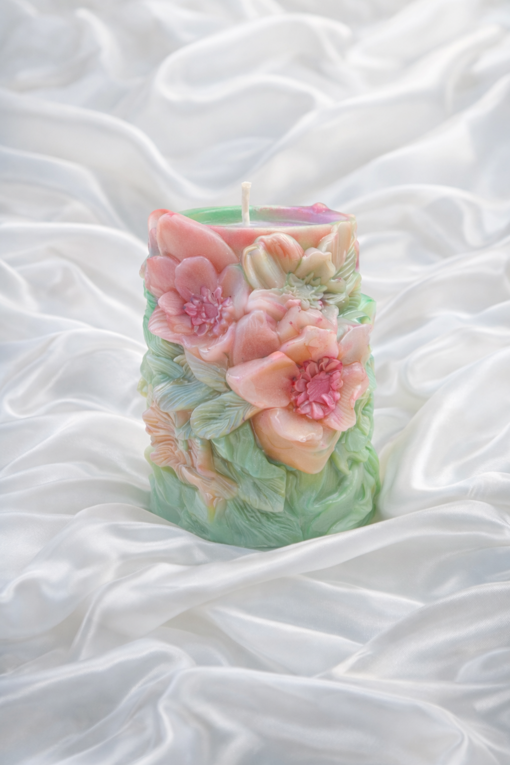 Elustuv kunst: Iga kroonleht ja leheke on vormitud detailse täpsusega, luues mulje, justkui kasvaksid õrnad pastelsed õied otse küünla südamest välja.