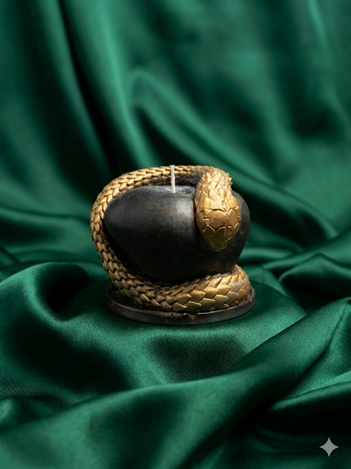 Süsimust õun, mida ümbritseb säravkuldne madu, loob võimsa kontrasti, mis püüab pilku ja tekitab huvi. Kuid selle küünla tõeline võlu avaneb alles siis, kui tahiots leegi saab.