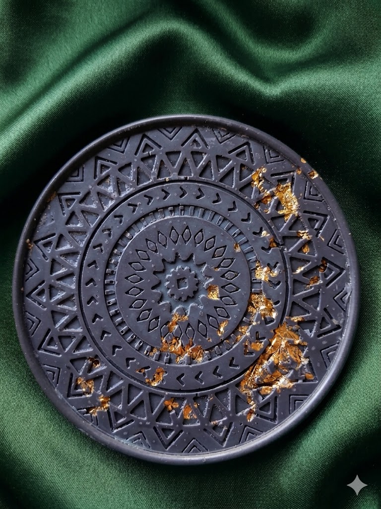 See käsitööna valminud dekoratiivne lõhnaküünal jesmoniit-alusel on sümbol täis sügavust, ahvatlust ja iidset tarkust.