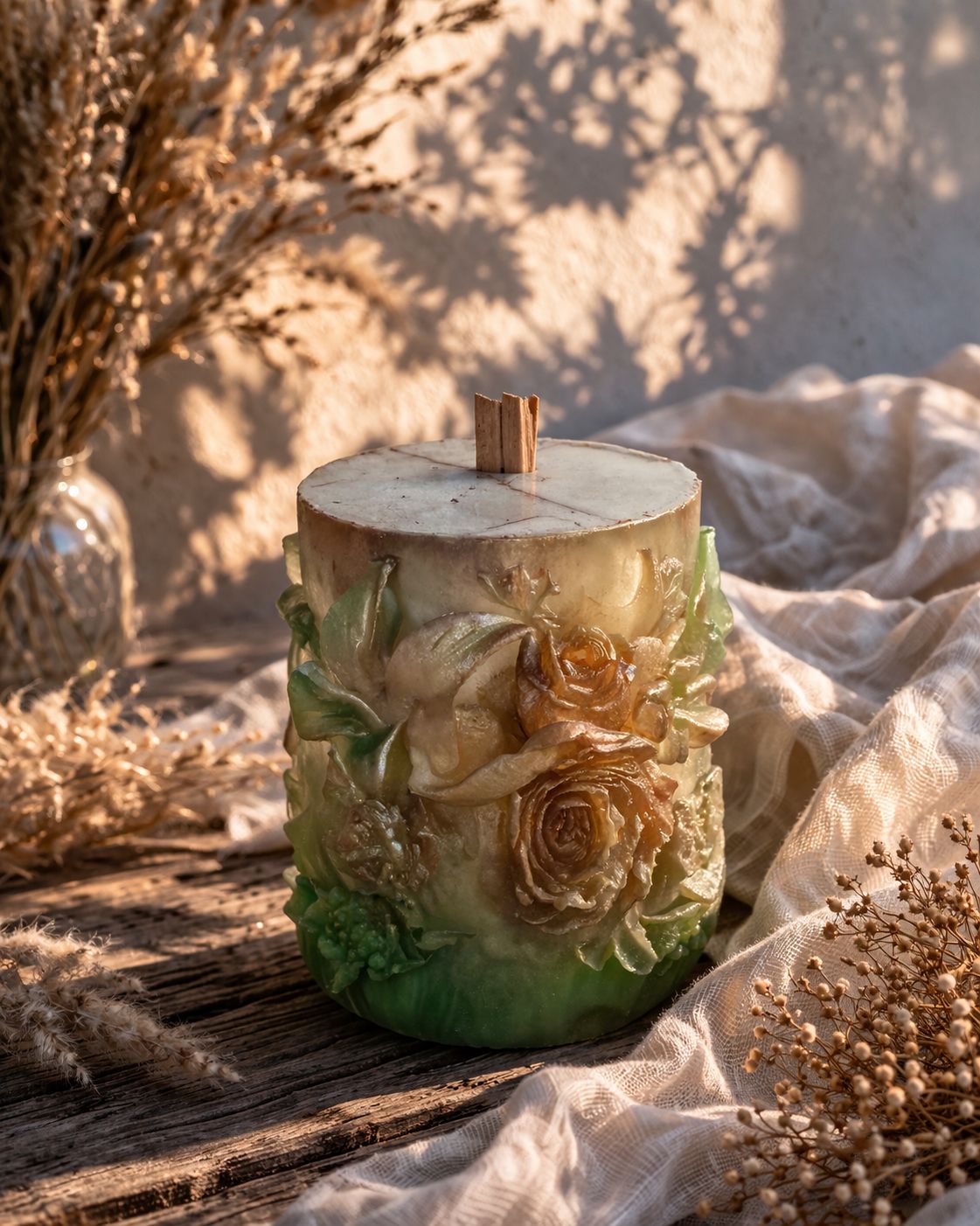 Rohelise ja sooja kuldse vahel peitub tasakaal — elu ja rahu, liikumise ja seismise vahel. See küünal ei küsi tähelepanu, ta lihtsalt on… ja selles olemises on midagi sügavalt rahustavat.