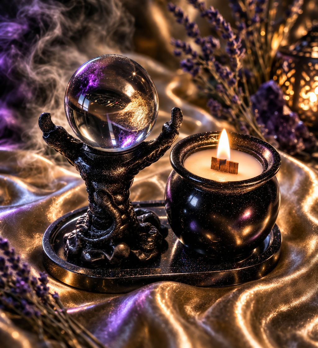 Kristallkuul kogub ja peegeldab energiat, justkui vaikne tunnistaja nähtamatutele voogudele. Selle all tõusev vorm meenutab iidset jõudu – midagi, mis ei ole kunagi päriselt kadunud.