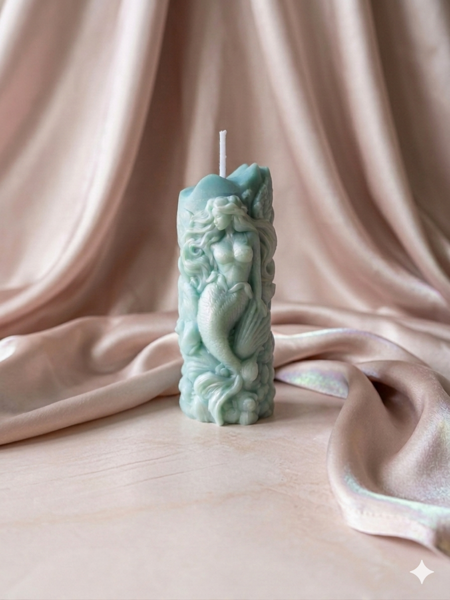 Müstiline disain: Iga detail sellel meresinise varjundiga küünlal jutustab loo vabadusest, ilust ja mere saladustest. Merineitsi graatsiline kuju on justkui hetkeks vahust kivistunud.